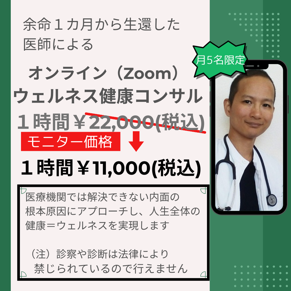【現役医師1時間Zoomコンサル】余命1カ月から生還した医師によるウェルネス健康コンサル